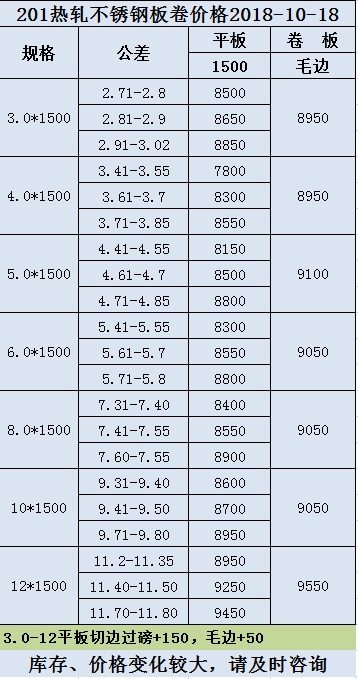 最新201不銹鋼板價格2018年10月1