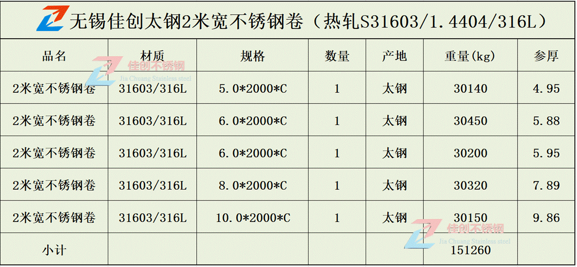 太鋼316L2米寬不銹鋼卷到庫,歡迎新老客戶訂購,此批材料為三標,既符合我國承壓設備GB/TGB24511-2017,又符合美標ASTM A240,同時符合德國不銹鋼標準DIN 17400