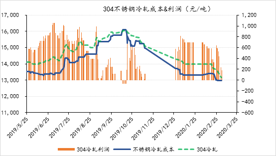 從目前304不銹鋼成本推算來看,按照高鎳鐵895元/鎳,高碳鉻鐵5650元/50來核算,304不銹鋼熱軋成本在11700元/噸附近,不銹鋼冷軋成本在12002元/噸,不銹鋼鋼廠冷軋利潤空間為﹣486元/噸,熱軋同樣面臨虧損情況為336元/噸,盈利率負(fù)數(shù)分別保持在-3.9%、-2.8%的樣子。